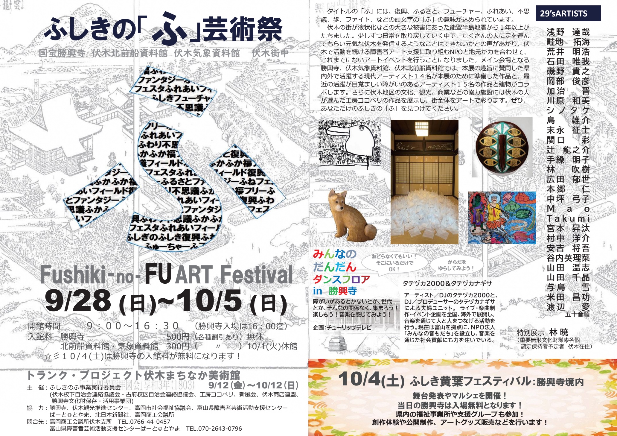 期間中の10月4日(土)には、勝興寺境内で「黄葉フェスティバル」も開催!県内の福祉事業者や支援グループも参加し、創作体験や公開制作、アートグッズの販売など、多彩なイベントが予定されています。また、同日14時からは、アーティスト夫婦ユニット「タテヅカ2000 & タテヅカナギサ」による「みんなのだんだんダンスフロア in 勝興寺」が行われ、障がいの有無や世代に関わらず、誰もが気軽に踊って楽しめる内容となっています。